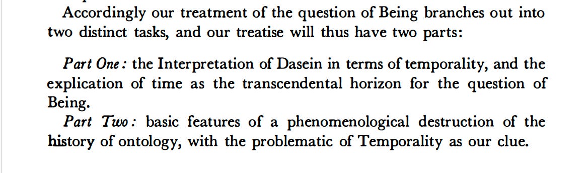 If you look back to section 8 of Introduction II, Heidegger proposed to write two parts to Being and Time, each containing three “divisions”, but only completed Division One and Division Two of Part One (with Division Two being rushed).