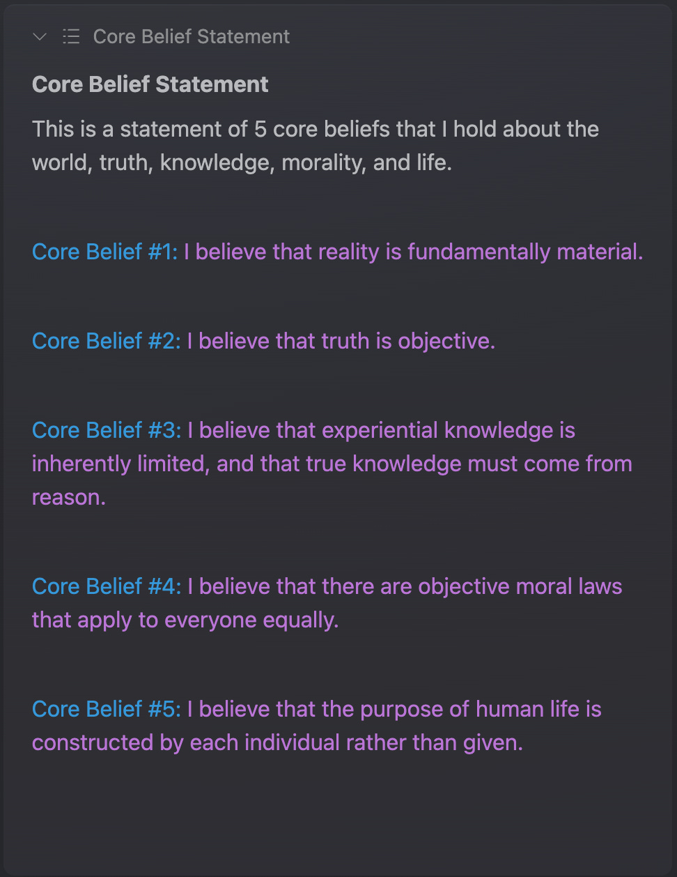 Ultimately, this organized system of beliefs will become a complete micro-philosophy, consisting of core beliefs, fringe beliefs, definitions, axioms, values, principles, and actions.