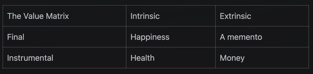 The combination of intrinsic and final value is useful for thinking about the sorts of pursuits that give our lives meaning and purpose.