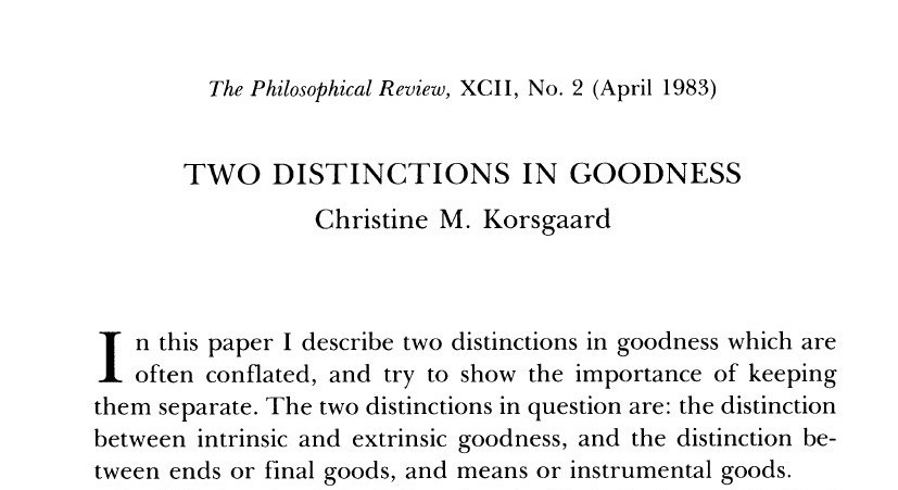 Intrinsic value and final value have often been treated to be the same thing throughout the history of philosophy, but in the late 20th century, the American philosopher Christine Korsgaard argued that they are actually distinct.